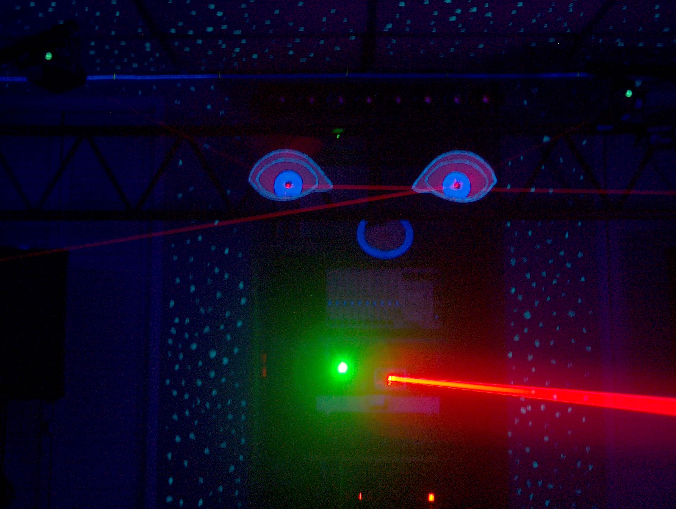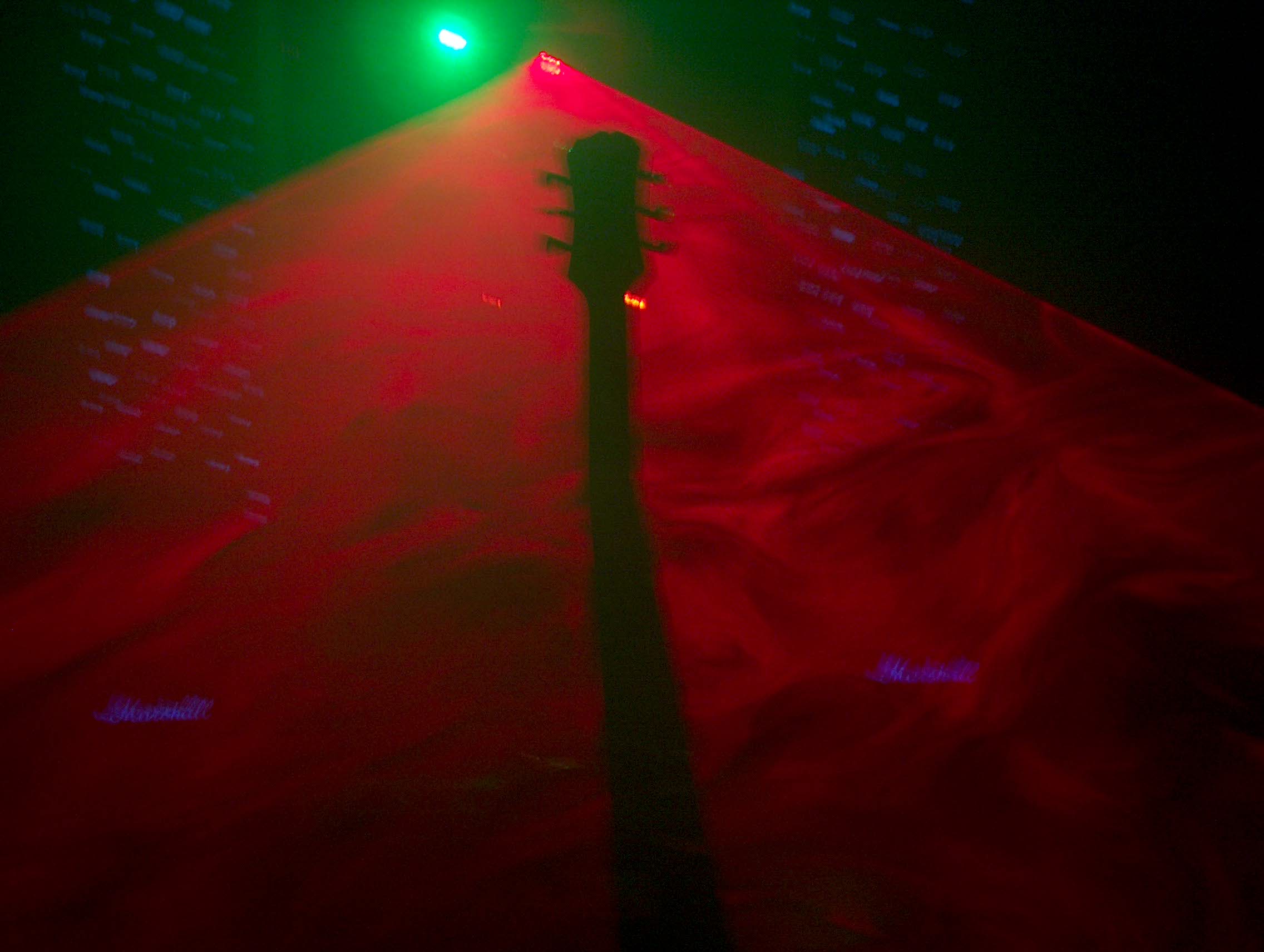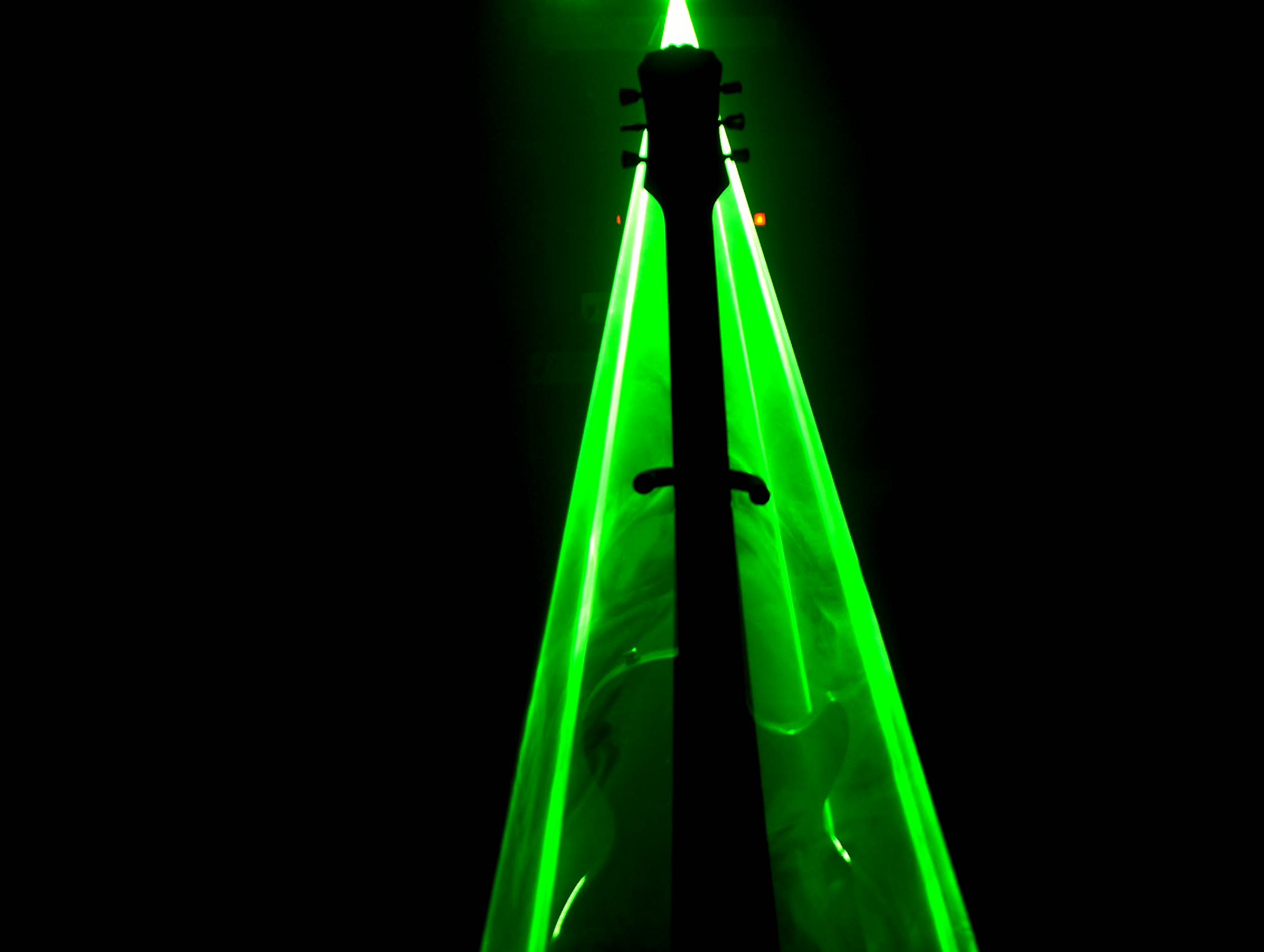 I was trying to do something different with the guitar studio. Instead of having a mass of unsightly wires and stacks of equipment, I set it up with a lighting truss and complete light show. At first was just a couple of lights, but now it has grown into the Great Laser Experiment. I now have a total of five commercial lasers, strobes, wash lighting, fog, and several special effects.