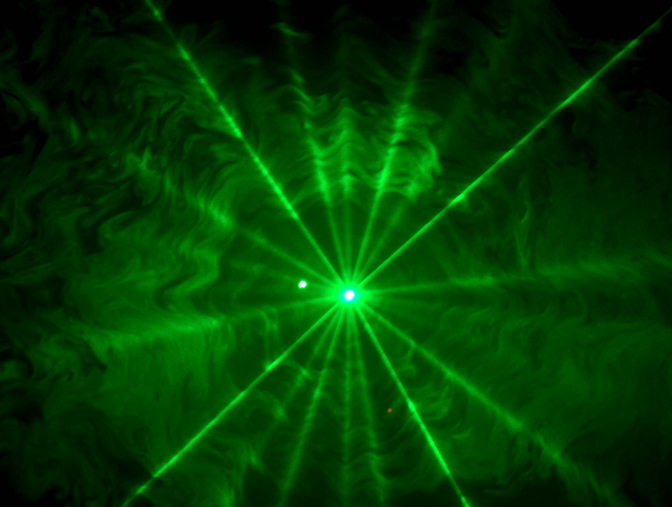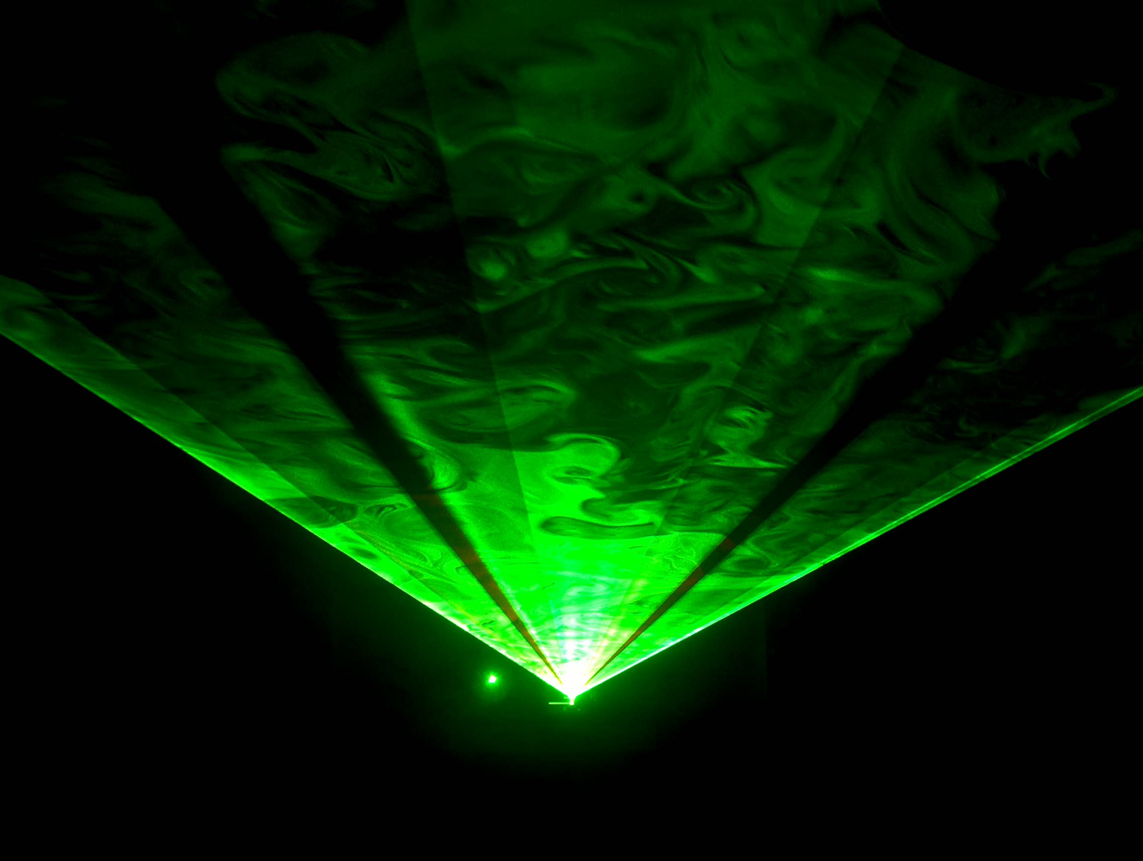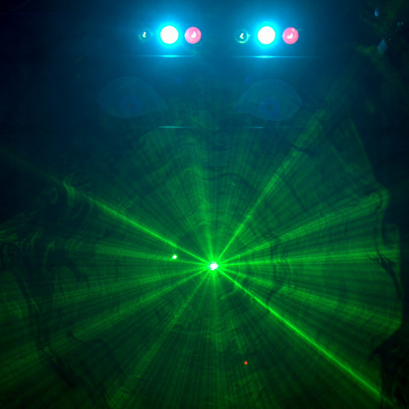 I was trying to do something different with the guitar studio. Instead of having a mass of unsightly wires and stacks of equipment, I set it up with a lighting truss and complete light show. At first was just a couple of lights, but now it has grown into the Great Laser Experiment. I now have a total of five commercial lasers, strobes, wash lighting, fog, and several special effects.
